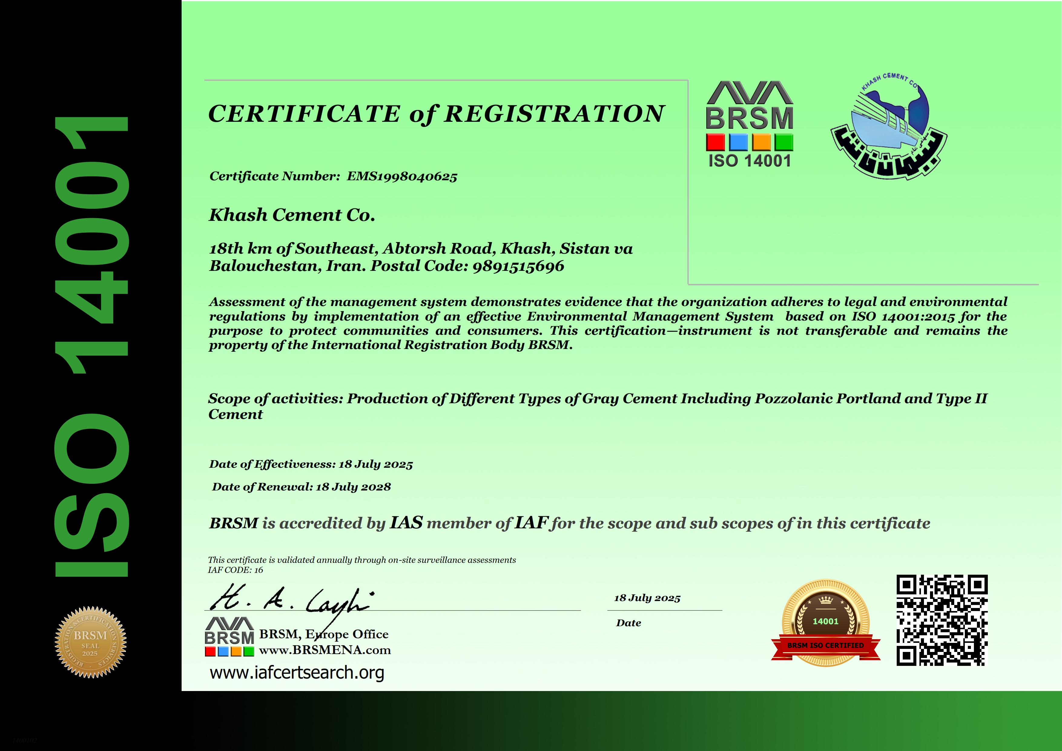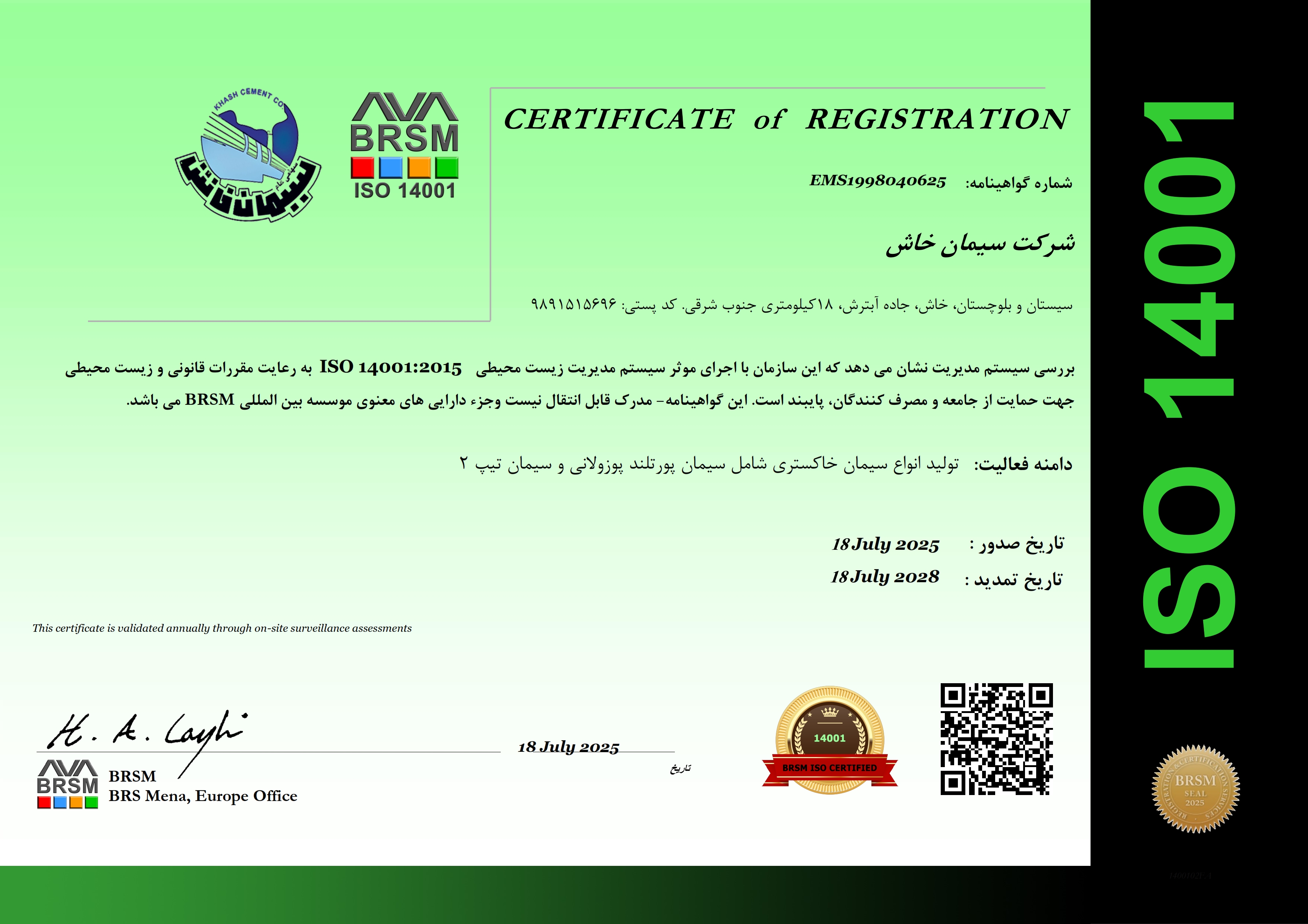 از آنجا که منابع طبیعی و محیط زیست تنها متعلق به نسلهای امروزنیست و آیندگان نیز از آن سهمی دارند و به منظور رعایت اصل توسعه پایدار که خواهان پیشرفت در زمینه صنعت و رفاه انسان و در عین حال حفظ محیط زیست و منابع طبیعی است ، استقرار سیستمهای مدیریتی همچون سیستم مدیریت زیست محیطی ISO ۱۴۰۰۱:۲۰۱۵ می تواند جهت نیل به این مهم مسمر ثمرباشد . این سیستم خواهان جلوگیری از آلودگی هوا ، آب و خاک ، استفاده بهینه از منابع طبیعی و صرفه جویی در مصرف انرژی می باشد . بدین منظورشرکت سیمان خاش(سهامی عام) با استقرار واستمرار سیستم مدیریت زیست محیطی تاکنون گام مثبت و موثری در خصوص بهبود مستمر فرایندها وفعالیتهای سازمان نهاده است . در این (راستا به طور سالیانه بر روی آلاینده های زیست محیطی حاصل از فعالیت های شرکت اندازه گیری صورت گرفته ) و در صورت مغایرت با استانداردهای زیست محیطی راهکارهای کنترلی برای آنها در نظر گرفته می شود . علاوه برآن شناسایی تاثیرات متقابل فعالیتها ، تجهیزات و خدمات بر روی محیط زیست ( جنبه های زیست محیطی ) و ارزیابی آنها ، دستورالعمل های مختلف جهت کنترل این تاثیرات مد نظر قرار می گیرد و بر اساس آنها هدف گذاری می شود . هچنین با انجام پایش هفتگی نیز بر روی وضعیت سیستم نظارت صورت می گیرد .
